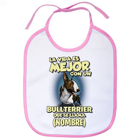 Babero la vida es mejor con un perro raza Bullterrier atigrado que se llama personalizable con nombre