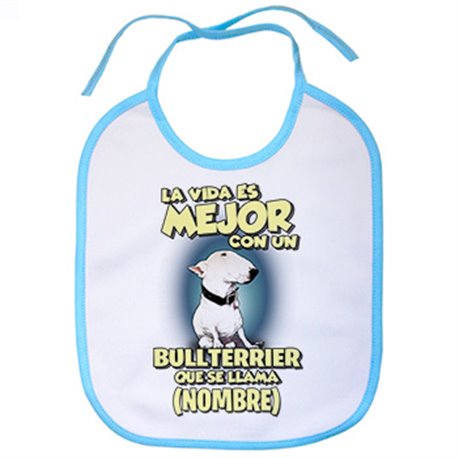 Babero la vida es mejor con un perro raza Bullterrier que se llama personalizable con nombre