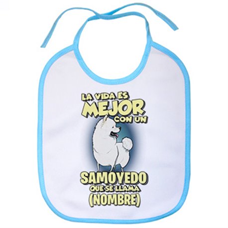 Babero la vida es mejor con un perro raza Samoyedo que se llama personalizable con nombre