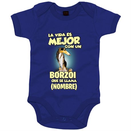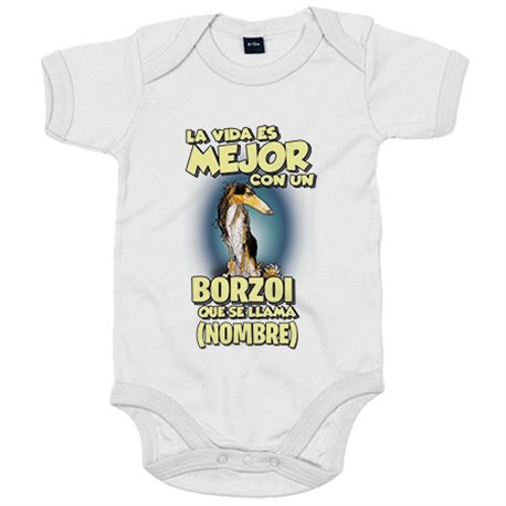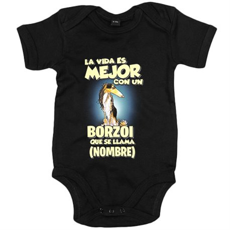 Body bebé la vida es mejor con un perro raza Borzoi blanco y negro que se llama personalizable con nombre
