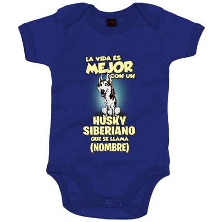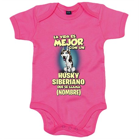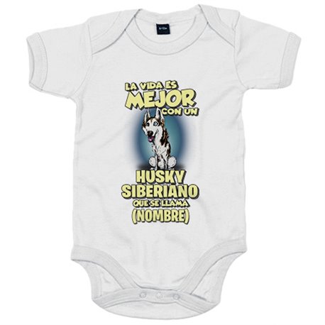 Body bebé la vida es mejor con un perro raza Husky blanco y negro que se llama personalizable con nombre