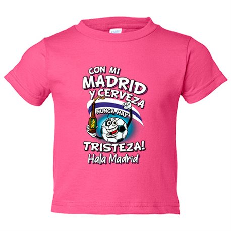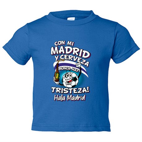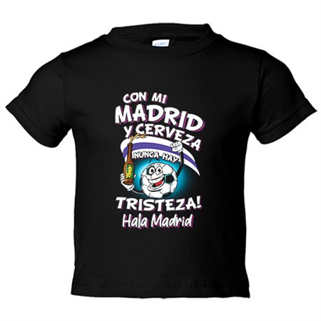 Camiseta bebé frase con mi Madrid y cerveza nunca hay tristeza merengue fútbol