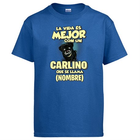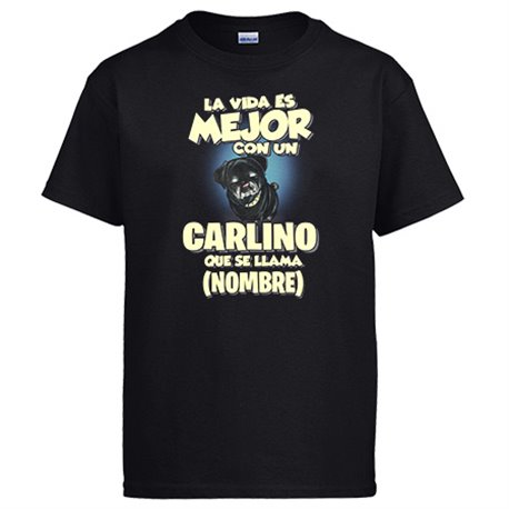 Camiseta la vida es mejor con un perro raza Carlino negro que se llama personalizable con nombre