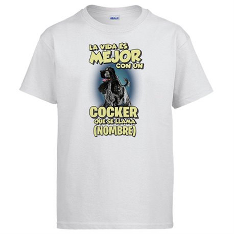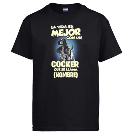 Camiseta la vida es mejor con un perro raza Cocker blanco y negro que se llama personalizable con nombre
