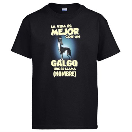 Camiseta la vida es mejor con un perro raza Galgo negro que se llama personalizable con nombre