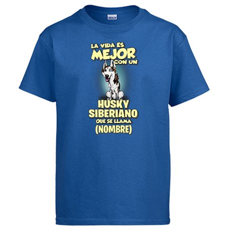 Camiseta la vida es mejor con un perro raza Husky blanco y negro que se llama personalizable con nombre