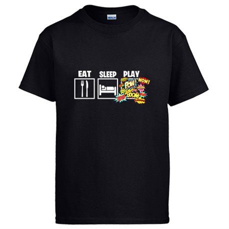 Camiseta para gamers viciados de los videojuegos de lucha y shooters con frase Eat Sleep Play